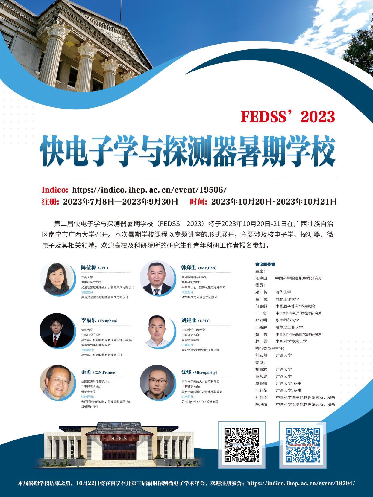 第二届快电子学与探测器暑期学校(FEDSS’2023)将于2023年10月20-21日在买球官方网站召开。本次暑期学校课程以专题讲座的形式展开,主要涉及核电子学、探测器、微电子及其相关领域,欢迎高校及科研院所的研究生和青年科研工作者报名参加。