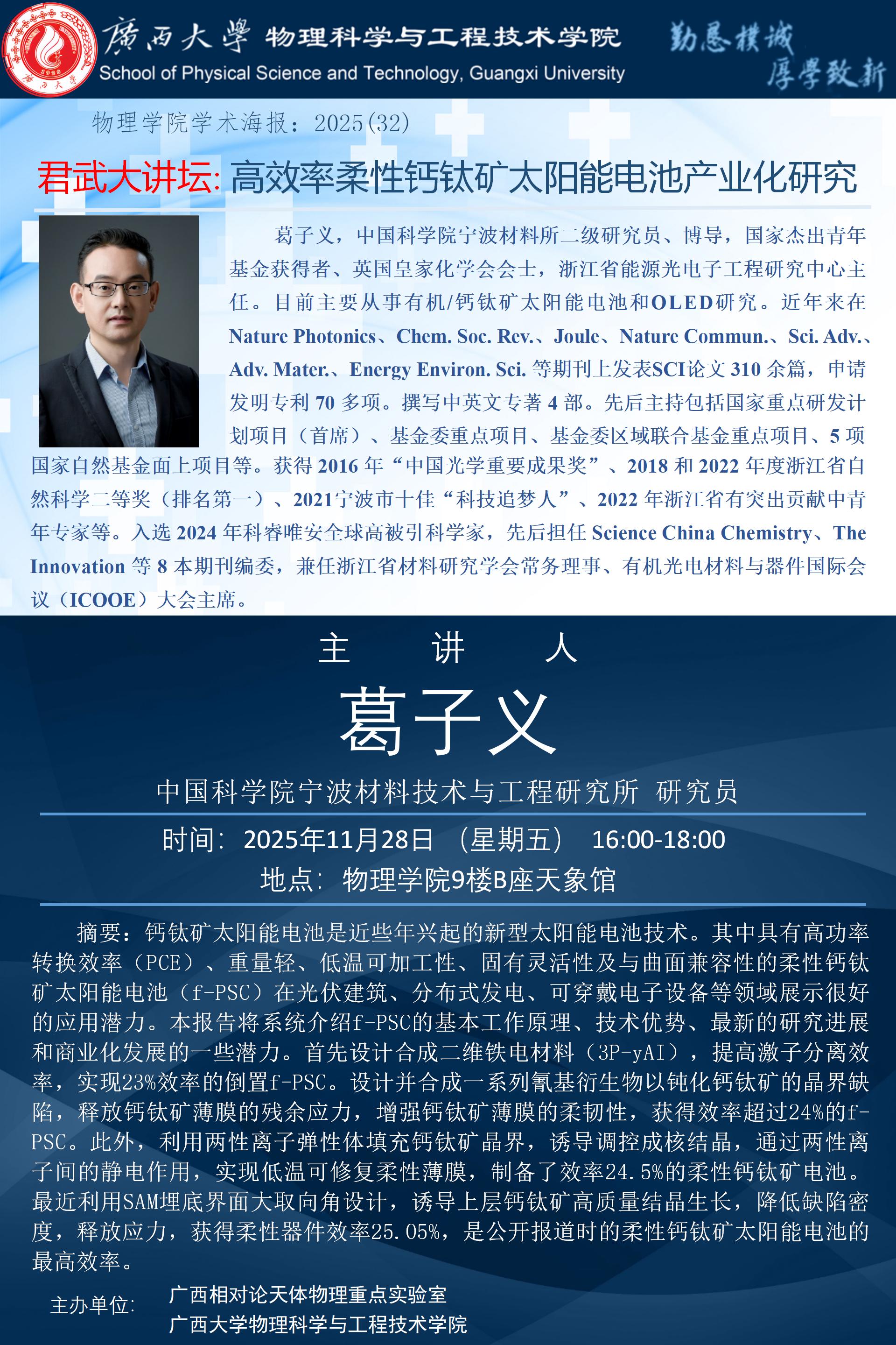 下一篇:2025年学术报告系列之31:君武大讲坛:有机太阳能电池中电压损失研究