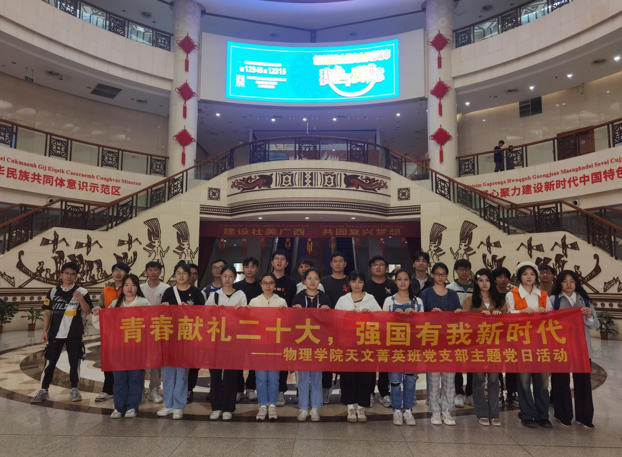 为学习贯彻党的二十大精神,筑牢民族团结奋斗的思想基础,进一步提高学生党员的使命感和责任感,更好地发挥党支部的战斗堡垒作用和党员的先锋模范作用,买球官网天文菁英班党支部于4月2日赴南宁市青秀山、广西民族博物馆开展“青春献礼二十大,强国有我新征程”主题党日活动。