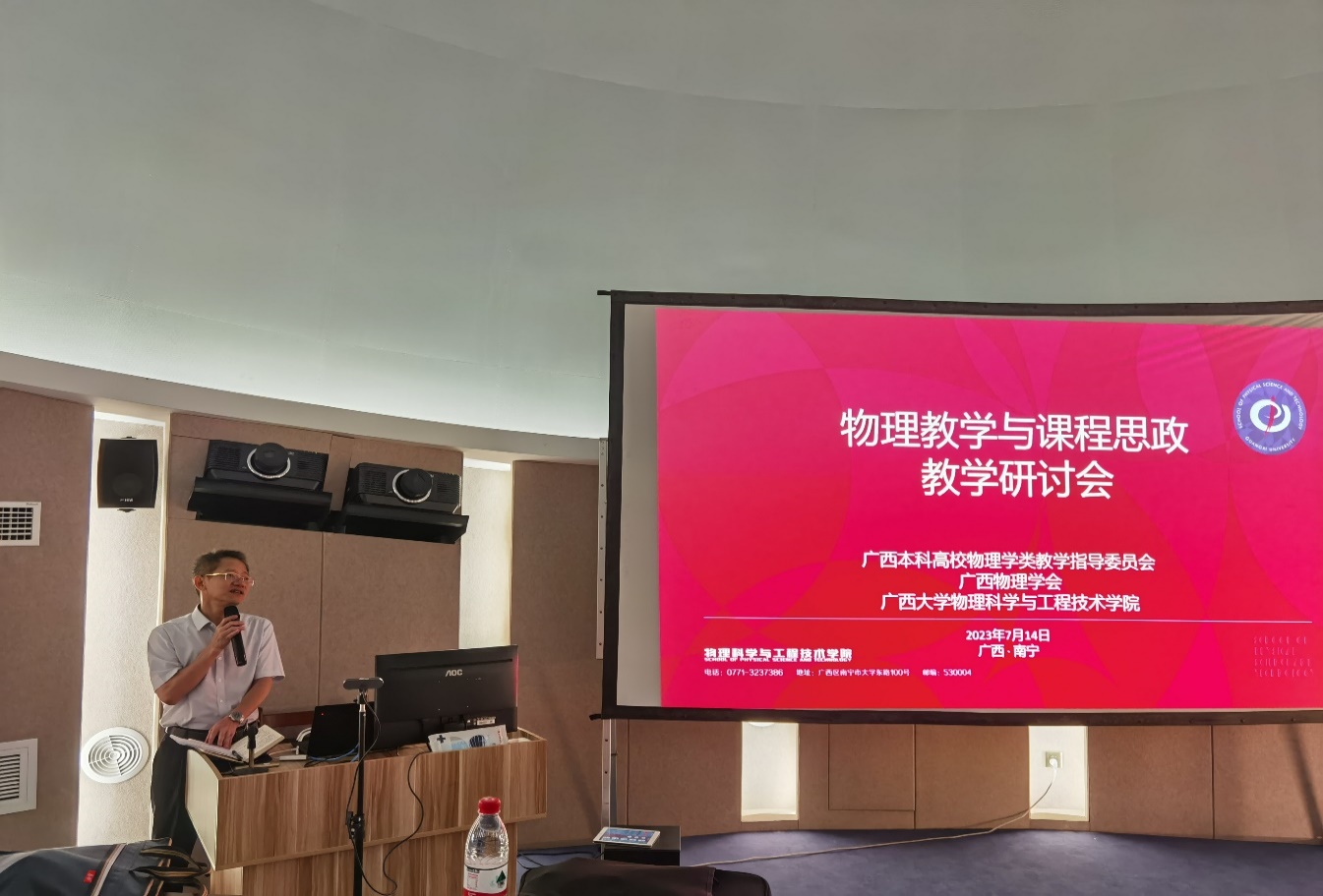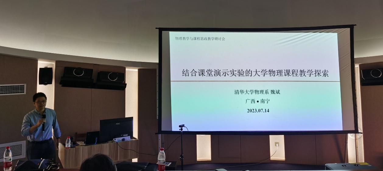 为更好地提升教师课堂教学能力,深化课程思政建设,更好地推进课程改革和思政建设,2023年7月14日下午,广西本科高校物理学类教学指导委员会、广西物理学会携手买球官方网站在买球官网天象馆举办《物理教学与课程思政教学研讨会》,研讨会邀请清华大学王青长聘教授、清华大学物理系魏斌副教授、大连海洋大学胡玉才教授三位专家做研讨会专题报告。买球官网全体教师(线下)、广西物理学会同行(线上)等参会,会议由袁涛书记主持。