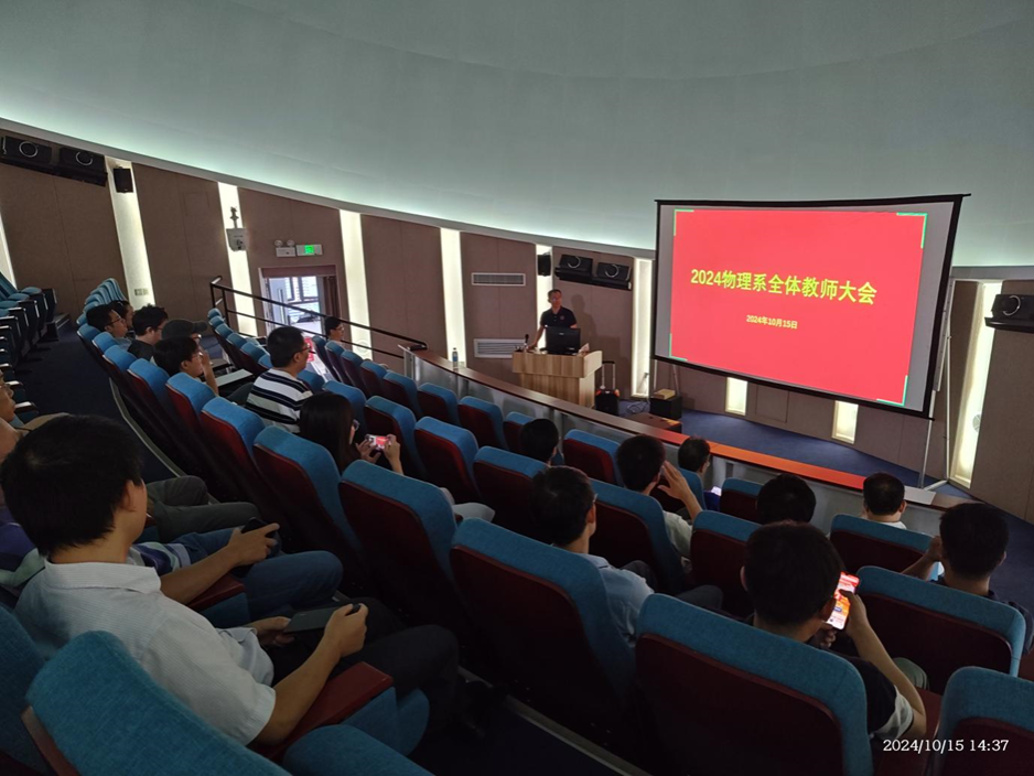 2024 年 10 月 15 日下午,买球官网物理系召开 2024 年全系教师大会。会议主要议题为总结教学与教研成果、剖析现存问题以及规划未来发展方向。会议由系主任梁毅主持,学院教学副院长林达斌出席,物理系副主任刘海镇、黄永波、黎光旭及全系老师参加会议。