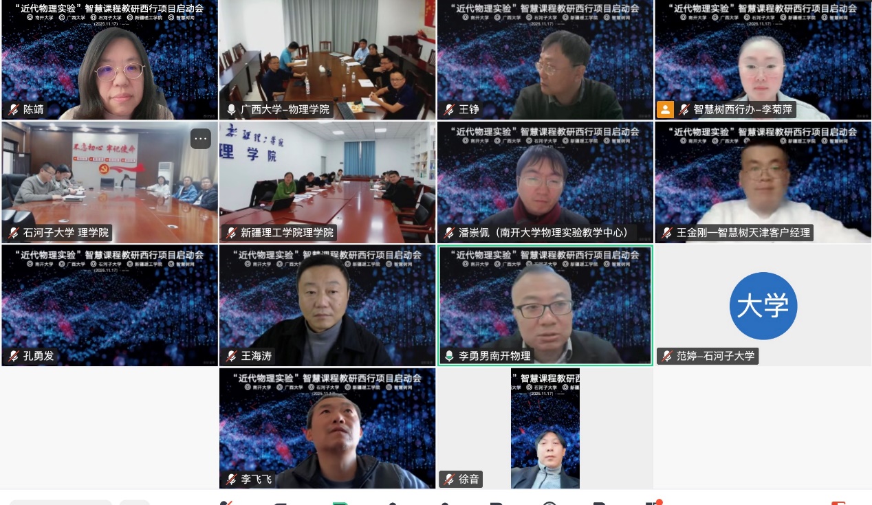11月17日,“近代物理实验”智慧课程教研西行项目启动会以线上线下相结合的方式顺利举行。该项目由南开大学、买球官方网站、石河子大学、新疆理工学院与智慧树网共同发起,旨在进一步深化“慕课西部行2.0”行动,推动西部高校实验教学水平整体提升。本次会议聚焦跨校教研协作机制的构建与完善,重点推动买球官方网站积极向南开大学学习先进教学理念与课程建设经验,促进优质教学资源的共建共享。通过发挥南开大学的示范引领作用,带动买球官方网站及西部地区高校增强实验教学“造血”功能,探索形成可持续、高质量的教学发展新路径。