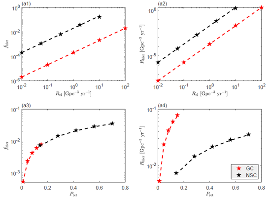 恒星演化理论预测,由于对不稳定性,新形成的黑洞在质量上存在空缺~65-130M。在星团中发生的等级式黑洞并合可以解释这种恒星塌缩形成黑洞质量空缺,受到该领域学界的关注。但是等级并合的研究极大地受到计算力的挑战,因为基于混合蒙特卡罗或N体模拟大质量星团的方法几乎不可能搜寻相关参数空间。目前的研究大多使用半解析模型。本工作中,作者从黑洞并合遗迹在星团中的保留概率出发,巧妙设计、推导出了一个等级黑洞并合率公式,表明等级并合率与保留概率成正比。发现虽然在球状星团的等级并合效率远低于核星团的并合效率,但是由于相比核星团,球状星团有更高的总的双黑洞并合率。这导致在球状星团的等级并合率和核星团的等级并合率不相上下。这意味着LIGO-Virgo探测到的等级并合事件起源于球状星团的概率与起源于核星团的概率大致相等。该解析结果有助于理解星团逃逸速度和第一代黑洞并合的反冲速度对等级黑洞并合率的影响,有助于对GW190521等等级并合事件候选体起源方面的研究。