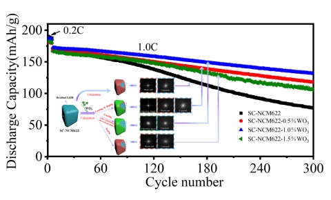 本研究通过调控钨的含量,实现了对单晶富镍三元正极材料的单包覆、单掺杂、既包覆又掺杂,提高了三元正极材料的综合性能。改性样品的10.0 C/1.0 C放电比容量比值为86.3%。此外,在1.0 C下循环300次后,放电比容量为131.5 mAh/g,容量保持率为76.2%, 放电比容量比原始样品提高了54.7 mAh/g,容量保持率比原始样品提高了31.2%。这项工作针对目前三元正极材料存在的问题,提供了一种钨包覆及掺杂的单晶富镍三元正极材料的有效改性方案。