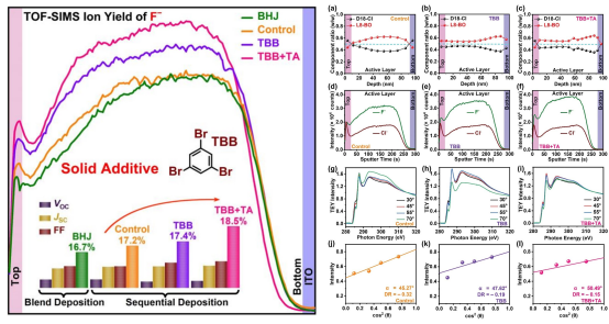 买球官网薄膜光伏团队与韩国浦项科技大学Kilwon Cho教授等人利用具有高挥发性和低成本的1, 3, 5-三溴苯(TBB)作为受体溶液中的固体添加剂,并采用顺序沉积方法制备有机太阳能电池(Organic Solar Cells,简称OSCs)的光活性层,再结合热退火(TA)来调节由D18-Cl/L8-BO组成的OSCs光活性层中的垂直相分布。研究通过加入添加剂TBB,再结合热处理,在薄膜中形成长距离的分子填充和均匀的“双连续给体-受体”网络,从而提高薄膜的结晶度和在垂直方向上有利的供体-受体分布。研究中"TBB+TA"处理过的OSCs实现了18.5%(平均18.1%)的光电转换效率,VOC为910 mV,JSC为26.3 mA cm-2,FF为77.2%,优于其控制器件(17.2%,平均16.7%的光电转换效率)。器件性能的提高与激子生成速率、电荷载流子迁移率、电荷载流子寿命的增加以及双分子电荷重组的减少有关。该工作将先进的器件性能归因于垂直方向上梯度分布的给体-受体浓度,为优化顺序沉积的顶层形态以实现高性能有机太阳能电池提供了思路。