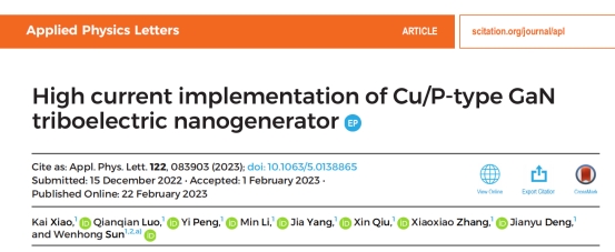 近日,买球官网孙文红教授领导的光电材料与器件团队在Nature Index著名学术期刊《Applied Physics Letters》上发表了题为"High current implementation of Cu/P-type GaN triboelectric nanogenerator"的研究论文。该论文被编辑选为"Editor's Pick"文章,在APL官网首页加以重点展示(Editor's Picks serve to highlight articles with excellent scientific quality and are representative of the work taking place in a specific field)。