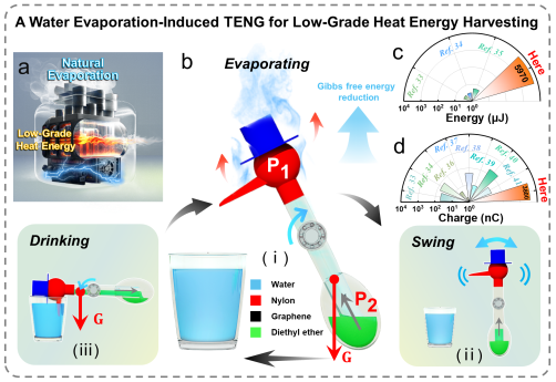 气候变化和环境污染带来的挑战日益严峻,减少传统能源使用,发展新兴能源技术成为全球共识。水在大气水循环中大量存在并不断循环,根据熵增原理,水在绝对零度以上皆具备蒸发的能力。水自然蒸发与外界存在热量交换,但如何高效利用自然蒸发过程中吸收的热能仍是一个难题。针对这一问题,买球官网蓝色能源团队与北京纳米能源与系统研究所合作,提出了首个完全依靠自然蒸发驱动的摩擦纳米发电机。它通过传统的饮水鸟与摩擦纳米发电机结合,利用自然蒸发过程中产生的空间非均匀热源驱动的热机对外做功,可将环境中广泛分布的低品位热能有效地转化为电能。该水蒸发摩擦纳米发电机不仅具有出色的发电性能,还展示了其在自驱动抑制碳钢材料在氯化钠溶液中的自发腐蚀中的应用。这项技术可随时随地通过液体的自然蒸发发电,具有广泛的适应性和应用价值,为周围环境中的低品质热能收集提供了新的技术方案。研究成果以"Evaporation Triboelectric-Nanogenerator: Harvesting Low-Grade Heat Energy From Ambient Environment"为题于2023年12月在线发表于国际期刊《Advanced Materials Technologies》上。
