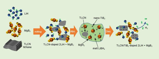 论文题目:Highly-dispersed nano-TiB2 derived from the two-dimensional Ti3CN MXene for tailoring the kinetics and reversibility of the Li–Mg–B–H hydrogen storage material