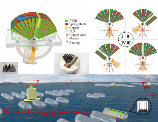 发展可持续的分布式供电方式对构建海洋物联网和智慧海洋系统至关重要。近年来,摩擦纳米发电机在有效收集低频海洋波浪能转化为电能方面表现出独特的优势,成为发展新型分布式可持续能源的潜力技术。买球官网蓝色能源团队发展了一种共轴承的电磁复合摩擦纳米发电机用于收集水波能,实现了原位的锂电池充电和可持续的供电应用。该复合纳米发电机具有独特的共轴承摆臂设计,在波浪的触发下,其TENG和EMG产生同频同相的运动,经分别整流后并联,产生高电压高电流输出信号。该复合发电机组成阵列可为海洋环境应用的器件提供工作时间长,使用便捷,无排放和无污染的可持续供电方案,在自驱动海洋物联网和智慧海洋系统中有广阔应用前景。
