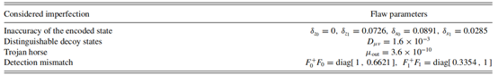 图中是我们的实验系统,LD表示商用激光二极管,BS1是75:25的光纤分束器,BS2是50:50的光纤分束器,是相位调制器,CPM是自制的偏振模块,ATT是光衰减器,IS是光学隔离,PC是偏振控制器,SPD是单光子雪崩探测器,PAM是偏振分析模块,TDC是 time-to-digital转换器。我们在接收端和发送端都使用保偏光纤。我们分别测量了系统发送端的制备不准确、诱骗态可辨,特洛伊木马参数以及接收端的探测效率不匹配。结果如图下所示: