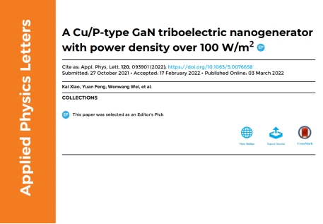 近日,买球官方网站孙文红团队在Nature Index著名学术期刊《Applied Physics Letters》上发表了题为“A Cu/P-type GaN triboelectric nanogenerator with power density over 100 W/m2”的研究论文。该论文被编辑选为“Editor's Pick”文章,在APL官网首页加以重点展示(Editor's Picks serve to highlight articles with excellent scientific quality and are representative of the work taking place in a specific field)。