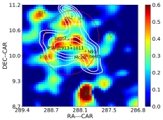 伽马射线为研究宇宙线起源这一“世纪之谜”提供了一个重要探针。有观测表明巨星团可能是银河系内一类重要的宇宙线源。助理教授孙晓娜与中国科技大学学者合作,基于最新的GeV伽马射线观测研究银河系内巨星团Mc20附近HESS J1912+101的高能宇宙线辐射。之前相关研究表明HESS J1912+101周围扩散的GeV辐射起源于由PSR J1913+1011驱动的脉冲星风云,10 GeV以上的GeV辐射与TeV辐射相关联,起源于壳层型的超新星遗迹。不同于前面的结论,我们发现扩散的GeV伽马射线辐射与分子气体具有空间分布一致性,从而支持GeV伽马射线强子起源。我们认为产生这些伽马射线的宇宙线质子可能来自超新星遗迹候选源HESS J1912+101或者巨星团Mc20。
