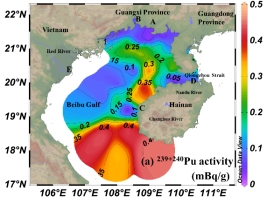 团队分析了北部湾表层沉积物中的钚同位素,研究了北部湾钚同位素的空间分布和来源。表层沉积物中的239+240Pu活度为0.012-0.451 mBq/g(平均值:0.171 ± 0.138 mBq/ g,n = 36),在南湾口呈现出逆时针方向下降趋势,趋势与北部湾的洋流相似。表层沉积物中240Pu/239Pu原子比为0.156-0.283(平均值:0.236±0.031,n=36),略高于全球沉降值0.18。这表明北部湾的钚来源受到了太平洋试验场(PPG)的影响,利用双端元模型计算出,PPG衍生的Pu的平均贡献估计为52%±24%。该研究首次揭示了PPG衍生的Pu的运输路径,在北部湾沿岸核电厂快速发展的背景下,为未来核电厂运行环境风险评估提供了基础数据。