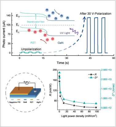 第三代宽带隙半导体GaN是制造紫外光电探测器的优秀候选材料之一,然而由于构建强内建电场以及抑制暗电流的技术难题,高性能GaN基自驱动紫外光电探测器仍然缺乏。买球官网蓝色能源团队与西安电子科技大学彭彪林教授合作,提出了基于铁电材料调控的高性能自驱动紫外光电探测器。采用溶胶-凝胶法制备了n-GaN/Pb(Zr0.2Ti0.8)O3异质结,构建了一个由铁电性质调制增强的倒装式自驱动紫外光探测器。在30 V极化后,倒装式GaN/PZT/ITO通过增强的PZT退极化场(Edp)和GaN/PZT异质结的内置电场(EGaN/PZT)有效耦合作用,展现了出色的紫外光检测性能。在365 nm光照下,其光电流响应相较于未极化状态增大了40倍,最大光暗比(Ilight/Idark)达到了3.07×107,响应时间高达0.51/0.57 ms,响应率(R)和检测率(D*)分别为176 mA W−1和6.94×1013 jones。该策略为高性能GaN基自驱动紫外光电探测器的设计提供了一种简单可行的方案。