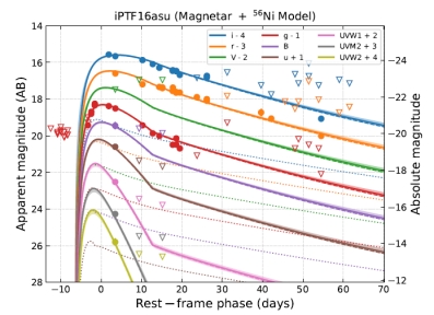 图:磁星+镍模型可以拟合iPTF 16asu的多波段光变曲线。图中实心圆点为观测数据,空心倒三角为观测上限[1]。