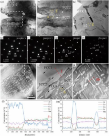 TEM results of the Al0.5CoCuFeMn alloys. (a) TEM bright-field image, (b–c) for the higher magnification corresponding to the white box in (a), (e–h) the selected area diffraction pattern of corresponding yellow circle region, (i) dark field image, (j–k) for the higher magnification corresponding in (i), (l–m) EDS line scanning results for the red line area. [1]