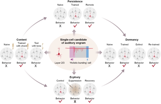 该研究基于双光子成像与靶向单细胞电生理记录方法深入探索听觉皮层“整全性簇放”(Holistic Bursting, HB)细胞的形成过程,并揭示HB 细胞符合德国心理学家 Richard Wolfgang Semon一个多世纪前提出的‘记忆印迹’(Engram)原始科学定义的 4 个特定条件(如图所示)。一是HB 细胞对某一个学得的复合和弦(chord)声音产生高频簇状发放响应(瞬间发放率100Hz量级、高于一般的自发发放活动水平2个数量级),而对任何一个组成该和弦的纯音(tone)则没有这样的响应。本研究成功复现了前序研究(Wang et al, Nature Communications, 2020)发现的HB细胞,并进一步揭示HB细胞是由静息的2/3层听皮层神经元在反复学习巩固过程中突变获得的,表明HB细胞在学习后的动物脑中不仅代表了学得的特定信息,而且这样的代表内容是在学习和巩固的过程中产生的(Content);二是HB 细胞一旦形成之后即长期稳定具备这样的功能特性,在学习过程完成后即便长时间不再学习,也会在过后的测试中一样保持该特性(Persistence);三是HB 细胞被学得声音诱发的高频簇状放电是在动物执行所学得的听音舔水行为之前发生,并被后者所依赖,抑制HB 细胞会破坏听音舔水行为(Ecphory);四是HB 细胞存在一个沉默状态,当已经学得的听音舔水行为进行声音与水奖赏分离的训练后,动物听到同样的声音不再进行舔水行为,此时大部分HB 细胞进入沉默状态,但一旦这个行为再次关联学习后,曾经进入沉默的同样一群细胞又重新恢复了高频簇状发放响应特性,而不是由另一群静息的细胞新转变成了HB细胞(Dormancy)。