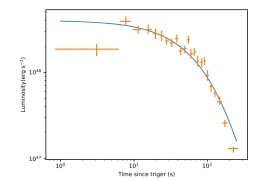 则说明GRB 230307A不是由于“tip of iceberg”效应所产生的。文中利用磁星作为中心引擎的模型和可变效率模型来拟合观测到的软X射线信号,且拟合得到的参数处于合理的区间内,如当