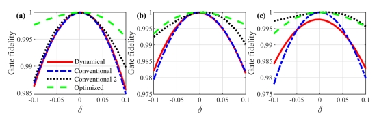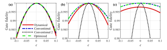 另一方面,常规非绝热几何量子门通常只能对某一种特定的噪声具有鲁棒性,难以实现对多种噪声的同步抑制。针对此问题,研究团队提出了一种实现优化几何门的通用框架,其中的演化路径是通过使用一系列新的优化复合脉冲来实现的。相应的优化几何门的演化路径如图1中(a)和(c)所示。这些复合脉冲可以降低几何门对失谐噪声的敏感性,同时不会引入额外的拉比频率噪声。图2所示为超导Transmon量子比特的数值模拟结果。结果表明,在实验相关退相干水平下,所设计的优化几何门可以同时有效缓解超导量子电路中的拉比噪声和失谐噪声。团队的研究结果为多噪声情况下的具有容错的几何量子计算打下了坚实基础。