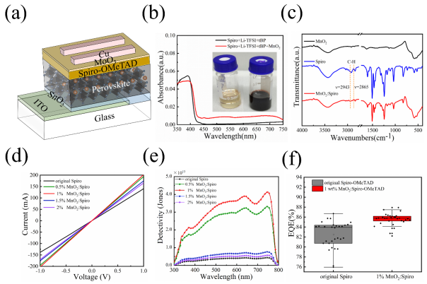 近日,买球官网光电材料与器件研究团队在钙钛矿基光电探测器的性能研究方面取得进展,研究成果以"High-efficiency perovskite photodetectors using manganese dioxide oxidation Spiro-OMeTAD as hole transport layer"为题被《Ceramics International》杂志接收发表。