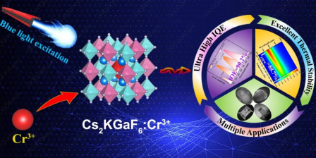 近红外(NIR)荧光转换发光二极管(pc-LED)是很有前景的新一代宽带NIR光源。然而,提高光致发光量子产率和热稳定性仍然是与pc-LED相关的宽带NIR荧光材料所面临的关键挑战。本文制备了一种同时具有高效率和高热稳定的宽带NIR氟化物荧光材料Cs2KGaF6:Cr3+,在蓝光激发下产生高效稳定的宽带NIR发射,其峰值位于782 nm处,FWHM为110 nm。值得指出的是,该荧光材料表现出90.2%的超高内量子效率(IQE)和优异的热稳定性(I150°C=88.7%),其优异的抗热猝灭性能主要是因为体系相对较弱的电子-声子耦合效应(S=2.17)。基于该荧光材料突出的发光性能,将Cs2KGaF6:Cr3+与商用蓝光LED芯片结合,制备了一种光电效率高达22.05%的NIR pc-LED器件。此外,使用该高性能LED器件作为光源,展示了其在夜视安检、无损检测、智能识别和生物医学成像等领域的应用,表明所制备的Cs2KGaF6:Cr3+荧光材料具有广阔的应用前景。