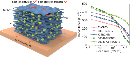 针对以上出现的问题,结合已有理论。买球官网新能源团队通过对Ti3CNTx基电极材料进行钾离子插层及表面改性,并进一步在Ti3CNTx层间引入银纳米线,得到了兼具高比电容和高倍率性能的300-K-Ag-Ti3CNTx电极材料。300-K-Ag-Ti3CNTx电化学性能的提高可归因于Ti3CNTx层间距的增加和表面官能团浓度的降低以及高导电性。实验结果表明,在纳米片之间插入阳离子并降低官能团浓度可以显著提高Ti3CNTx的质量比电容,在引入K+并去除官能团(-OH,-F)后,质量比电容大幅提高到464 F g-1。Ti3CNTx 基薄膜的电导率受层间阳离子和表面官能团的影响。300-K-Ag-Ti3CNTx薄膜的电导率增加到1030.93 S cm-1,并显示出优异的倍率性能,即使在2000 mV s-1下,其质量比电容也可以保持在245 F g-1。表现出优异的倍率性能。基于300-K-Ag-Ti3CNTx薄膜的全固态对称超级电容器在350 m W g-1时显示出6.9 mWh g-1的高能量密度,表明它们在柔性储能装置方面有很大的应用潜力。这项工作将进一步推动柔性MXenes基电极的研究;特别是Ti3CNTx基电极,在超级电容器和可穿戴电子设备领域具有广阔的应用前景。