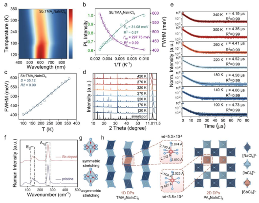 研究采用溶剂热法或盐酸辅助粉末策略合成了一维锑掺杂TMA2NaInCl6(TMA为四甲基铵)有机-无机杂化双钙钛矿。该材料表现出以583 nm为中心的宽带黄色发射,半峰宽为239 nm,PLQY高达98.9%。新型一维双钙钛矿材料Sb3+:TMA2NaInCl6在激发态下表现出较强的电子-声子相互作用,远远大于三维双钙钛矿材料。通过理论计算发现Sb3+掺杂调节了TMA2NaInCl6中的电子态密度分布,从而显著提高了自捕获激子发射的PLQY。对跃迁偶极矩的计算表明,跃迁概率增加了24倍。该研究还表明,黄色发光Sb3+:TMA2NaInCl6具有良好的热稳定性,在高功率LED、光电探测器等方面具有广泛的应用前景。