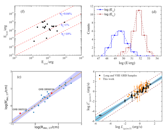 伽马射线暴(伽马暴,GRB)早期光学余辉光变曲线的onset特征是薄壳层情景标准外激波模型下的理论预测结果,买球官网博士生张璐璐与导师梁恩维教授合作在伽马暴余辉光变的样本分析研究中取得进展。通过收集整理Swift卫星发射以来的光学和X射线余辉的观测数据,选择了早期光学光变曲线呈现明显标准光变曲线特征的30个伽马暴样本。基于标准正向外激波型、采用贝叶斯推断方法,我们拟合了这些样本的光学和X射线余辉观测数据,给出相关物理参数的后验分布,计算了与喷流相关的物理量。研究发现,该样本的瞬时辐射效率分布范围为0.04%-10%,与物质主导喷流模型预测的低辐射效率一致。经几何修正后,瞬时辐射能量和喷流动能均表现为比较紧凑的正态分布,与前人提出的伽马暴喷流具有标准能量库的假设相吻合。特别地,研究发现火球减速半径(Rdec)、初始磁场强度(B0)以及磁场和电子的能量分配比例参数σB(σB=εB/εe)之间存在紧凑的依赖关系Rrdec,17=101.00±0.05B0-0.83±0.06σB0.26±0.02,该关系推断不同样本的喷流中电子所携带的能量占比基本一致。该样本同典型的长伽玛暴在3σ置信度水平内同样遵循Lγ,iso − Ep,z − Γ0三参量关系。本研究成果已被《The Astrophysical Journal》杂志接受发表。