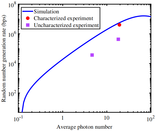 图2:随机数产生率随平均光子数的变化关系。蓝线表示仿真结果,红色点表示优化后的实验结果,紫色点表示未优化的实验结果。