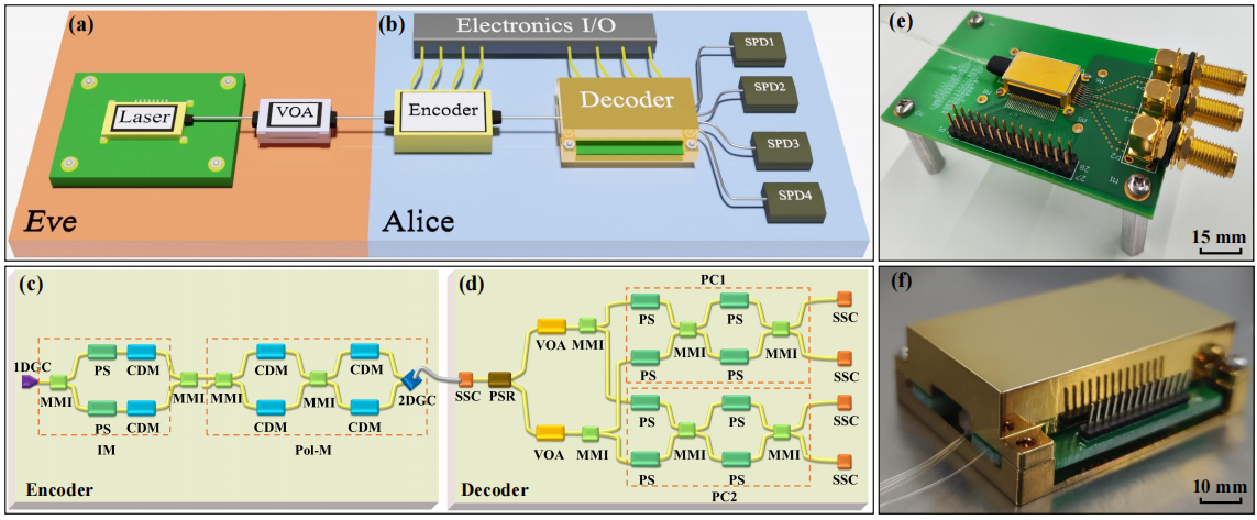 图1:集成QRNGs实验系统图。(a) 不可信源。Laser:激光二极管,VOA:可变光衰减器。(b) 可信但不需要表征的测量部分。Encoder:偏振编码芯片,Decoder:偏振解码芯片,SPD:单光子探测器,Electronics I/O:电子学控制设备。(c) 偏振编码芯片内部结构示意图。(d) 偏振解码芯片内部结构示意图。(e) 偏振编码芯片实物图。(f) 偏振解码芯片实物图。