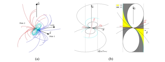 近日,以买球官方网站为第一单位,来自国家天文台、北京大学、贵州师范大学和中国科学院大学的研究人员,利用中国天眼FAST对全相位辐射的射电脉冲星B0950+08进行偏振观测,绘制出了脉冲星B0950+08的三维磁层结构和子午面辐射几何(磁轴和自转轴共面),如图1所示