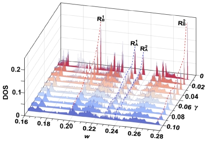 图 1. 100组随机数组成的平带的平均DOS分布,无序度为0.01 ~ 0.1。