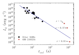 理论上,短伽马射线暴被认为可能起源于双中子星并合,并合的产物可能是一个超大质量的磁星,且并合时会产生千新星辐射和引力波辐射。短伽马暴GRB 210323A的X射线余辉光变中存在时长长达~10⁴秒的平台辐射,并且伴随着斜率为-3.2的下降段。GRB 210323A的平台辐射是目前所有观测到的短伽马暴中持续时间最长的。这一特征表明GRB 210323A很可能来自于双中子星并合,并合形成的超大质量磁星的电磁偶极辐射能量注入可以解释平台辐射。陡峭的下降段可以解释为这颗超大质量磁星坍缩成为黑洞。该工作对设置红移为1、0.37和0.01时,GRB 210323A的坍缩时标-光度关系进行了限制。通过对X射线余辉光变进行拟合,使用拟合参数限制了这一伽马暴可能的超大质量磁星中心引擎的物理参数上限。限制得到的磁星磁场和初始自转周期上限相较其他短伽马暴更小。利用限制结果,该工作还对并合产生磁星中心引擎时可能会发生的引力波和千新星事件做出了观测可能性分析。对于并合事件的引力波辐射,经计算发现使用LIGO和Advanced LIGO难以探测到,但是Einstein Telescope在GRB210323A的红移低于0.37时仍有可能探测到。而对于千新星辐射,该工作使用r过程和磁星供能的千新星辐射模型进行了计算并和不同仪器的光学观测上限进行了比较,发现在红移为1时没有仪器能够观测到相关千新星辐射;但是在红移等于或小于0.37时一部分仪器可以观测到千新星辐射。