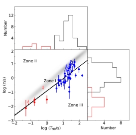 图3:τ-T_90 关系图。其中红点代表短暴,蓝点代表长暴;空心点代表单脉冲暴,灰色区域是模拟的单脉冲暴分布区域