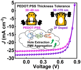 针对以上问题,买球官网薄膜光伏团队与福建海峡实验室、韩国浦项科技大学合作,选择具有给体-受体-锚定集团的小分子材料2F来修饰PEDOT:PSS,通过提高导电性来克服界面层的膜厚限制。研究证实,2F小分子聚集在了ITO表面,形成了偶极层,从而改善了PEDOT:PSS的聚集方式,提高了电导率、增加了功函数,最终表现出了更好的电荷提取效率以及更低的漏电流密度。因此,2F修饰的PEDOT:PSS界面在基于PM6:Y6作为活性层的有机光伏电池中,实现了17.1%的效率,高于对照组器件的15.7%,效率的提升主要来源于由电荷提取导致的电流密度提高。而且,当进一步将界面层的膜厚提高到170nm后,以2F修饰PEDOT:PSS为界面层器件的效率仍然实现了超过15%的效率,体现了其优异的膜厚容忍性。利用1,3,5-三溴苯作为固体添加剂后,以2F+PEDOT:PSS为界面层的基于PM6:Y6、PM6:BTP-eC9、PM6:L8-BO器件的效率分别达到了18.3%、19.2%和19.1%。该研究揭示了通过小分子策略修饰空穴界面层来提高器件性能的有效性,对于有机光伏电池的产业化应用具有深刻意义。