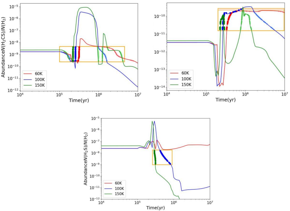 我们搭建了一个气体—尘埃表面—冰三相模型,通过比较观测和模型的结果,发现在一段时间(约2-3×105yr)内,模型与测量的H2S、H2CS和HCS+的丰度相匹配。在这些源中,H2S、H2CS和HCS+的丰度随着SiO丰度的增加而增加,这意味着激波化学很重要,在进一步建模时,需要考虑激波的影响。