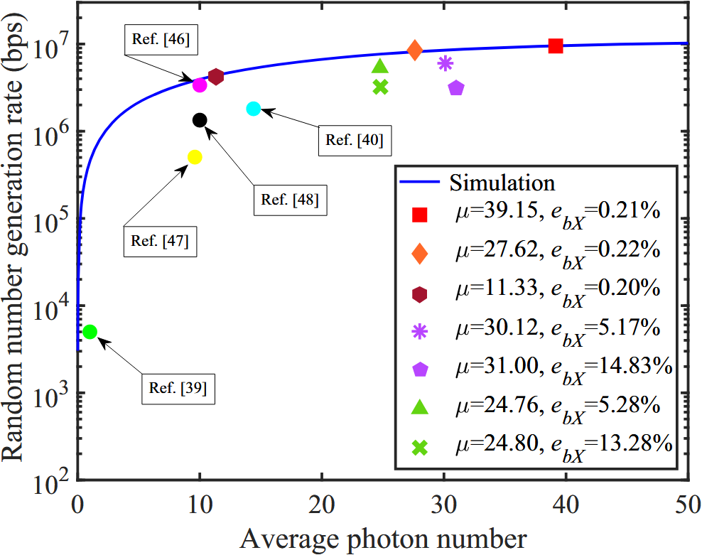 图2:安全量子随机数生成速率与平均光子数的关系(最优/非最优参数场景)