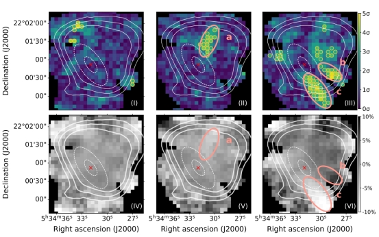 其中,位于研究区域北部和西南部的区域a和区域b的PD变化具有超过4σ和3σ的显著性水平。位于西南部的区域c的PD则显著降低,其显著性水平超过5σ。然而,偏振角(PA)未表现出明显的变化。
