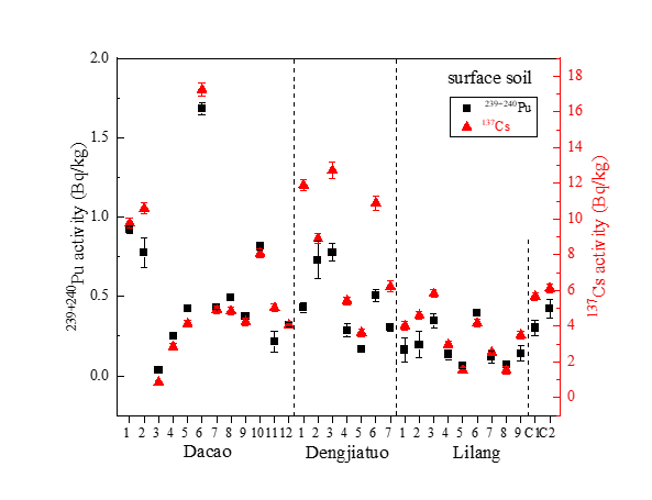 图1: 239+240Pu和137Cs比活度在典型天坑表层土壤中的分布