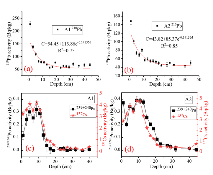 研究发现,土壤中238U、232Th、226Ra和40K的垂直分布较为均匀。此外,表层土壤中238U、232Th和226Ra的分布趋势相似。 在表层土壤中,239+240Pu和137Cs的活度范围分别为0.037 ± 0.008至1.680 ± 0.037 Bq/kg,以及0.86 ± 0.09至17.25 ± 0.38 Bq/kg。柱状中,137Cs的比活度范围分别为0.12 - 4.36 Bq/kg和0.29 - 4.76 Bq/kg,而239+240Pu的比活度范围则分别为0.001 - 0.321 Bq/kg和0.004 - 0.390 Bq/kg。240Pu与239Pu的原子比以及137Cs与239+240Pu的活度比均显示该地区的人造放射性核素主要源自大气沉降。 通过210Pbex分布曲线及土壤中137Cs与239+240Pu的数据分析得出的沉积速率具有较高的一致性。同时,239+240Pu与137Cs在土壤中的分布表现出高度相似性,其偏差主要归因于土壤物理化学性质对其影响。最后,利用CDE模型预测了研究区域内这两种核素在未来100年后的分布情况。