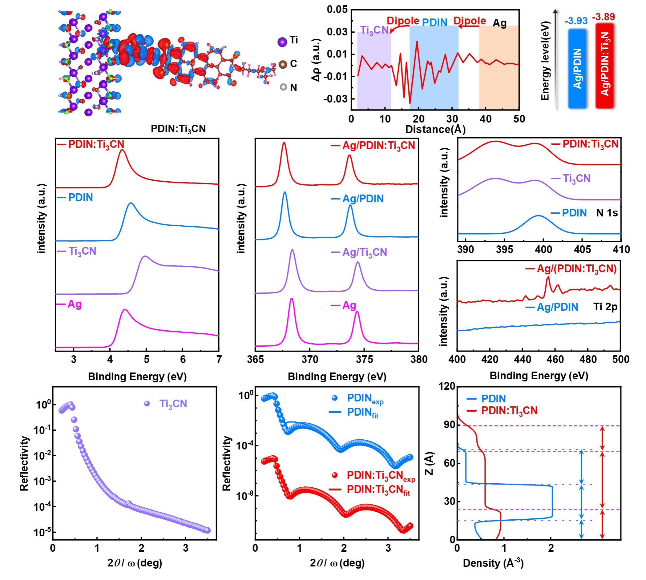 针对以上问题,买球官网薄膜光伏团队联合四川大学和淮北师范大学采用混合阴极界面层策略(将具有高光学透明度和优异导电性的MXenes二维材料Ti₃CN,修饰PDI及其衍生物)调控PDI分子的聚集行为,揭示Ti₃CN与PDI界面层的N-N耦合作用机制。当在PDIN中引入1 wt%的Ti₃CN时,Ti₃CN表面钛原子通过电子转移与含有氨基的PDIN形成定向偶极结构。N-N相互作用下Ti₃CN:PDIN混合阴极界面层有更合适的能级匹配,增强导电性,从而提升电荷提取性能。此外,Ti₃CN的引入有效调控了PDIN薄膜的垂直相分布,使PDIN更加致密有序,降低陷阱态密度,形成更光滑的表面,从而构建高效的电子传输路径,显著增加了阴极界面层的膜厚耐受性。将该界面层应用于PM6:BTP-eC9和PM6/L8-BO有机太阳能电池器件时,分别实现了20.0%和19.5%的PCE,器件稳定性得到提升。本研究提出的N-N耦合策略为开发高效有机太阳能电池混合阴极界面层提供了新的见解。