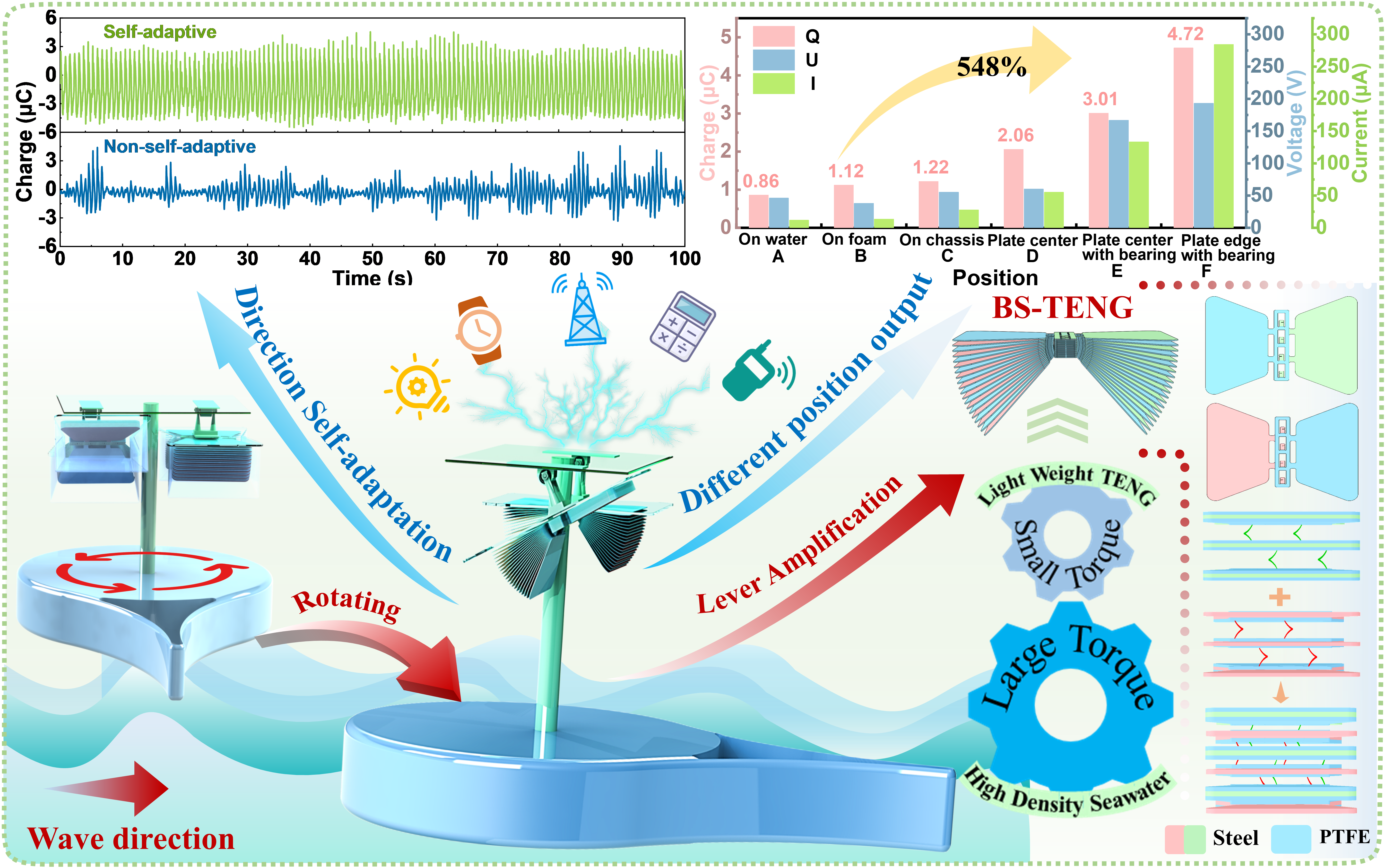 为了解决以上问题,买球官网蓝色能源团队设计了基于自适应平台的仿生向日葵方向调整策略以及相应的新型蝶形堆叠摩擦纳米发电机(Butterfly-stacked triboelectric nanogenerator, BS-TENG)。该系统不仅可以在无额外电力消耗下自动调整自适应平台朝向使其对准波浪方向,从而使悬挂其上的BS-TENG高效捕获波能。还利用了杠杆原理将低振幅、高扭矩的波浪能转化为高振幅、低扭矩的动能,从而使致密摩擦层能够充分地接触分离,在弱波条件下与直接漂浮水面的BS-TENG相比,基于自适应平台的BS-TENG电荷输出提高了548%,显著提高了能量利用率。BS-TENG由半覆膜激光蚀刻的Si-Mn 弹簧钢板制成,消除了内部布线、框架和惯性质量。这种超轻设计简化了制造和材料消耗,实现了6.75 cm²g-1的质量摩擦面密度(SSA)。系统研究了该平台的工作机理和输出特性,单个BS-TENG的最大转移电荷量达到了13.68 μC,并证明了有效收集弱波能量为多个电子设备供电的可行性。该策略可与各种收集波浪能的TENG 轻松集成,为弱波浪能收集提供了一种可扩展且经济高效的解决方案。