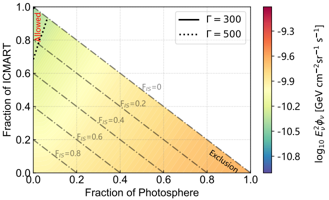 该研究提出了一种创新方法,首次利用伽马暴的弥散中微子流量上限对伽马暴瞬时辐射的三种主流模型各自所占的比例进行限制。该研究通过两种独立方法(使用由3739个真实的伽马暴组成的样本进行计算和对假设的光度函数进行积分来进行计算)来计算伽马暴的弥散中微子流量,并对IceCube最新公开的数据进行了分析,得出最新的伽马暴的弥散中微子流量上限,然后将这一新得出的伽马暴的弥散中微子流量上限和两种独立的方法计算得出的伽马暴的弥散中微子流量进行结合,对不同伽马暴瞬时辐射模型的占比做出了限制。限制结果与伽马暴的洛伦兹因子和质子与电子的能量均分因子的比值有关。